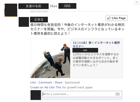 もちろんコンテンツの一部のように見えるいわゆる「ネイティブ広告」な訳ですが、「いいね!」「コメント」「共有」ボタンが広告の下に設置されています。