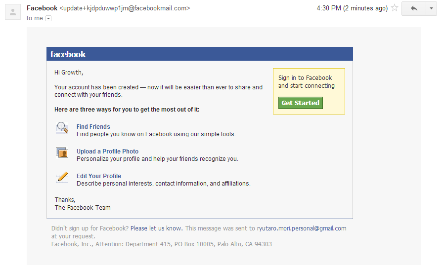 イベントメールはフェイスブックがリテンション最適化に活用したグロースハックチャネルの1つに挙げられます。友人申請、メッセージの通知、投稿へのコメント、いいね!などなど、あらゆるアクションをEメールと連動することで、注意関心を引き寄せ続けることに成功しました。