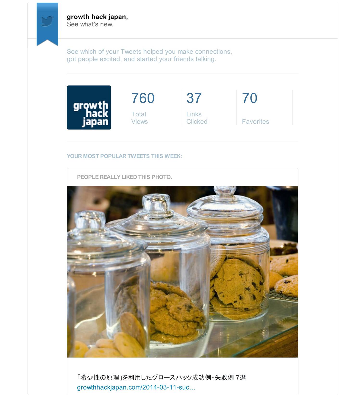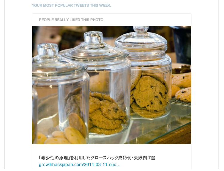 その下には、「YOUR MOST POPULAR TWEETS THIS WEEK:」=「今週最も人気のあったあなたのツイート:」の文字と、「PEOPLE REALLY LIKED THIS PHOTO」=「ユーザーが最も気に入った写真」という画像のキャプチャーが。