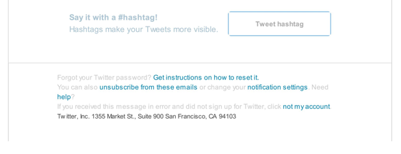 メールの末尾には、「Say it with a #hashtag! Hashtags make your Tweets more visible.」=「ハッシュタグをつけてツイートしよう! ハッシュタグをつけることで、あなたのツイートがより多くのユーザーに見てもらえるようになります」の文字と、「Tweet hashtag」=「ハッシュタグをつけてツイート」の利用喚起ボタンが表示されています。