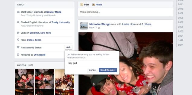 今までこの施策が適用されてきたのは、学校名、電話番号、email、居住地、出身地などの基本情報に限られてきましたが、今回の試験的なアップデートにより、友人の交際関係にも「Ask」ボタンが設置されるようになったのです。