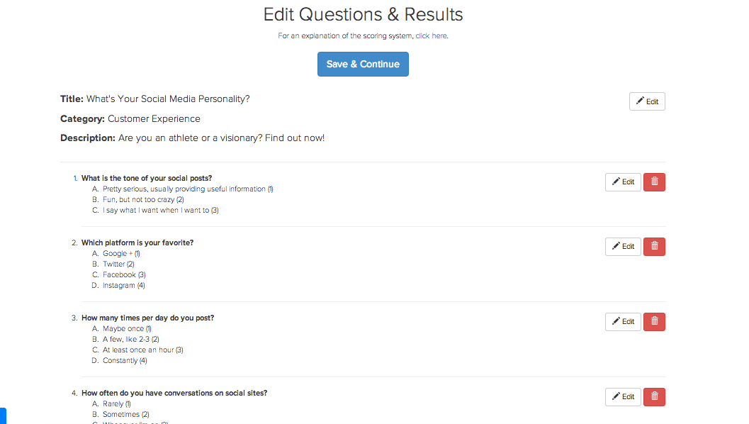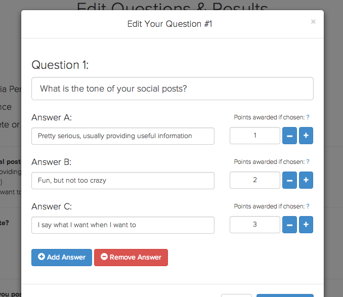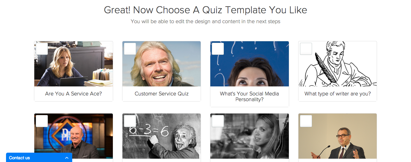 「グロースハッカー適正チェック」、「UX知識テスト【上級編】」、「起業家タイプ診断テスト」などなど、ソーシャルメディア上でよくシェアされている形式のクイズが簡単に制作出来ます。