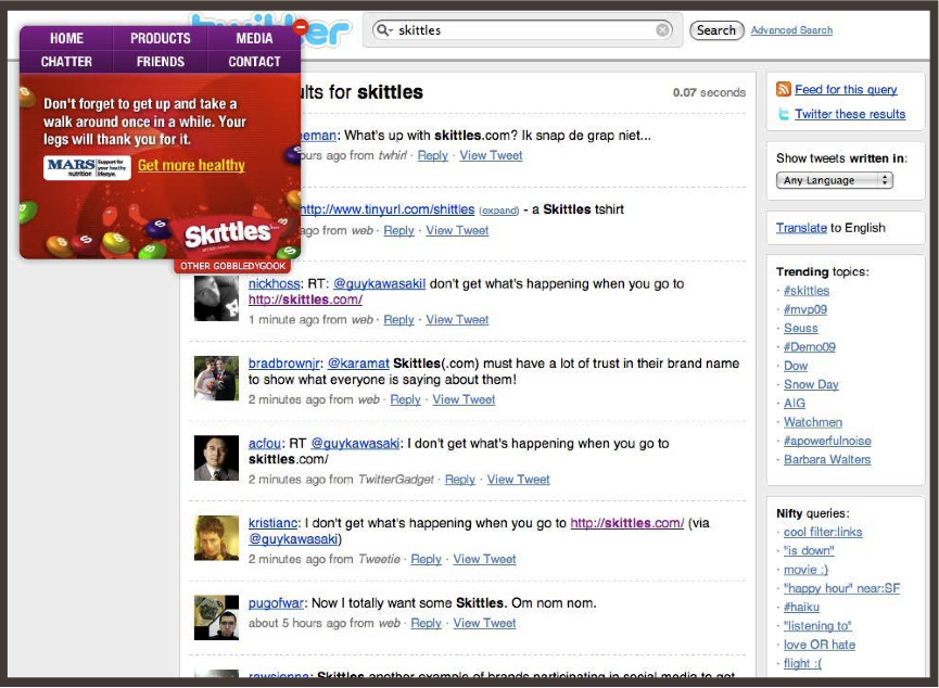 ・ 毎度ながら、独創性は新たな可能性を見出してくれます。アメリカでは知らない人はいないだろう、という程有名な駄菓子Skittlesの製造会社は、自社ホームページ画面にSkittlesという語句が入ったツイートを自動で取得するTwitterのフィード画面を表示したことがありました。その期間中はSkittlesに関するツイートが数えきれない程なされ、人々の注目を集めたのです。