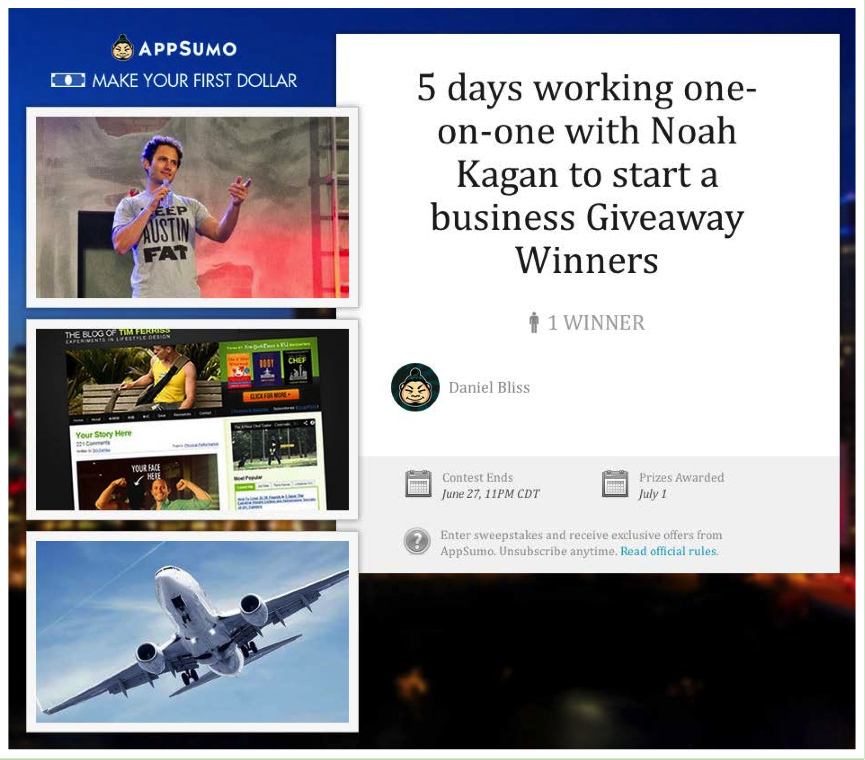 下にAppSumoがコンテストの景品として提供した一例を載せますが、優勝すればAppSumoの創業者Noah Kaganと5日間1対1で仕事ができるなんて、イカしてますよね!