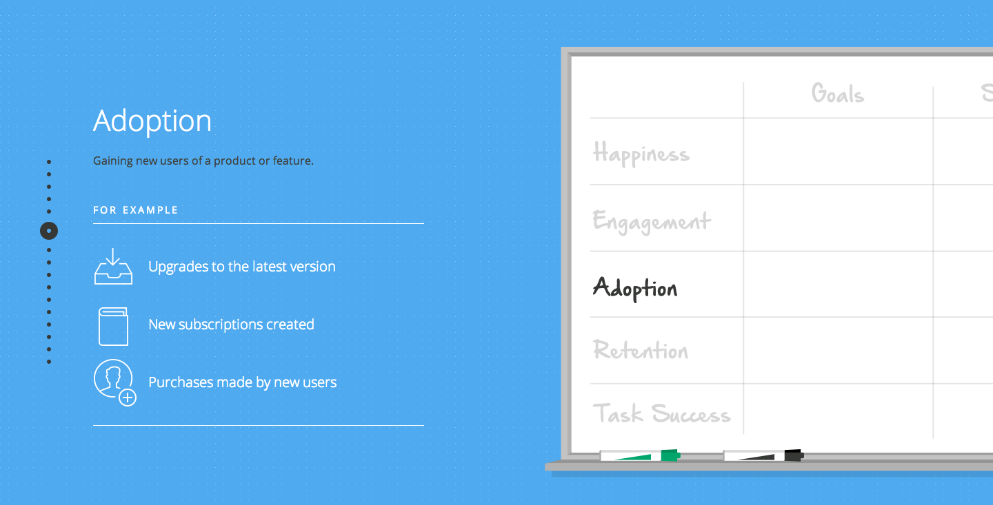 ユーザーが最新版にアップグレードした数、新たにユーザー登録した数、新規顧客の購入回数や金額など、プロダクト全体や一部の機能に初めてかかわったユーザーに関するデータがAdoptionの構成要素にあたります。