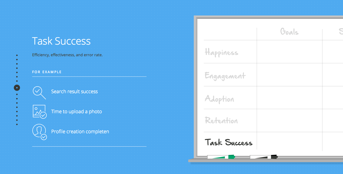サイト内検索の正確さ、写真のアップロードにかかる時間、プロフィール完成率など、具体的なタスクの成功に関するデータがTask Successの構成要素にあたります。