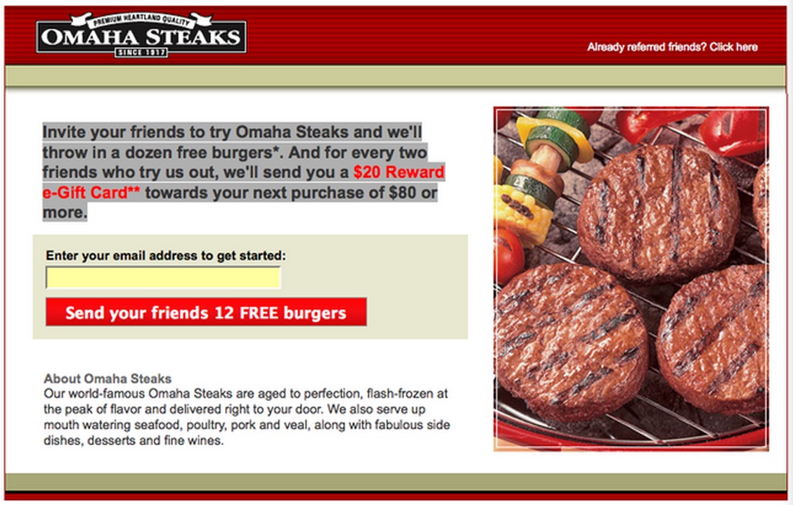 ランディングページでリファラルをユーザーにお願いしているOmaha Steaksを見てみましょう。