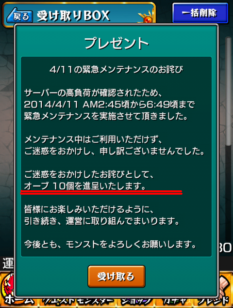 ソーシャルゲームでは不具合やお詫び時にアイテムを付与しているものが大変多いです。これによって怒ったユーザーを戻して、元のモチベーションと同じかむしろ高く、ゲームに戻していきます。
